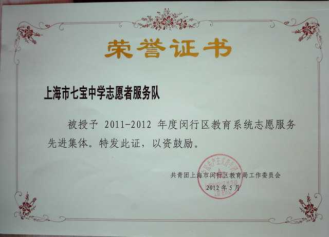 七宝中学志愿者服务队----被授予2011-2012年度闵行区教育系统志愿者服务先进集体(证书)