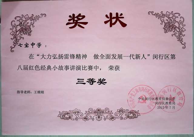 2012.07七宝中学----获“大力弘扬雷锋精神,做全面发展一代新人”闵行区第八届红色经典小故事讲演比赛三等奖(奖状).jpg