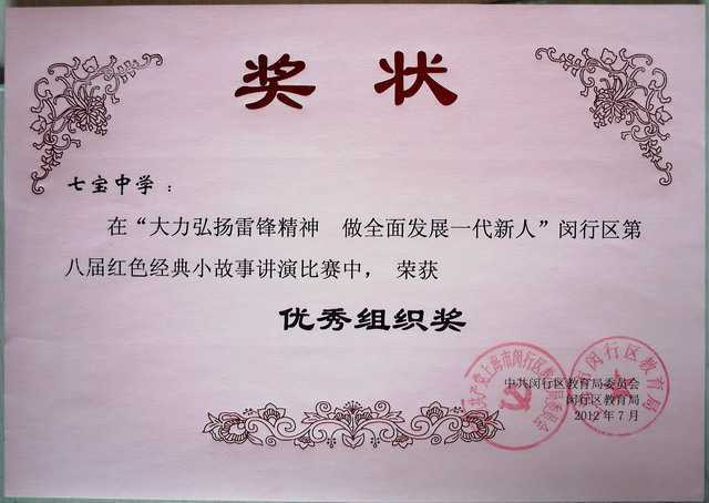 2012.07七宝中学----获“大力弘扬雷锋精神,做全面发展一代新人”闵行区第八届红色经典小故事讲演比赛优秀组织奖(奖状).jpg
