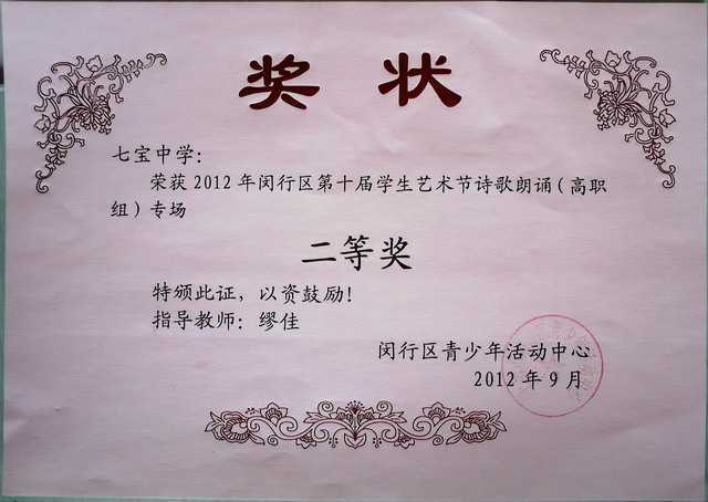 七宝中学----获2012年闵行区第10届学生艺术节诗歌朗诵(高职组)专场二等奖(奖状)