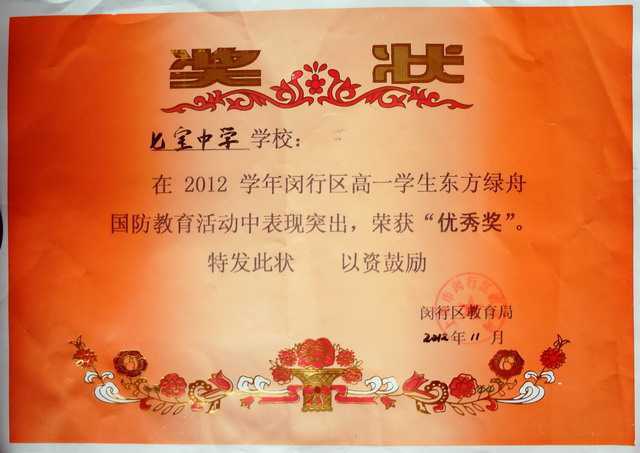 七宝中学----获2012学年闵行区高一学生东方绿舟国防教育活动“优秀奖”(奖状)