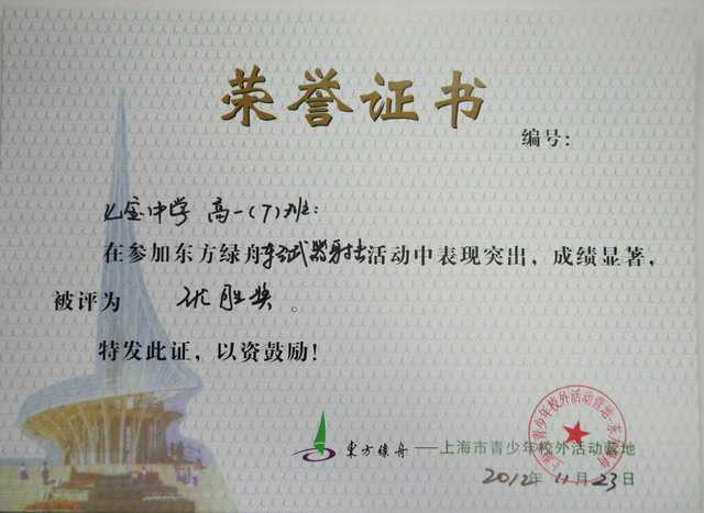 七宝中学高一7班----获东方绿舟轻武器射击活动优胜奖(证书)