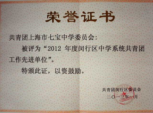 七宝中学团委----被评为2012年度闵行区中学系统共青团工作先进单位(证书)