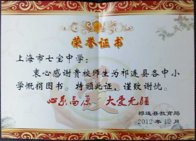 “心系高原,大爱无疆”感谢七宝中学师生为祁连县各中小学慨捐图书(捐赠证书)
