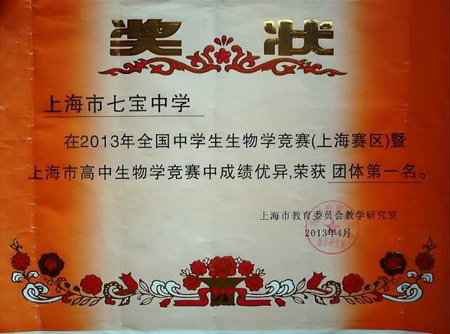 七宝中学----获2013年全国中学生生物学竞赛(上海赛区)暨上海市高中生物学竞赛获团体第一名(奖状