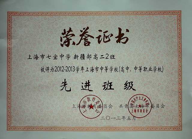 2013.05七宝中学新疆部高二2班----评为2012-2013学年上海市中等学校(高中、中等职业学校)先进班级(证书).jpg