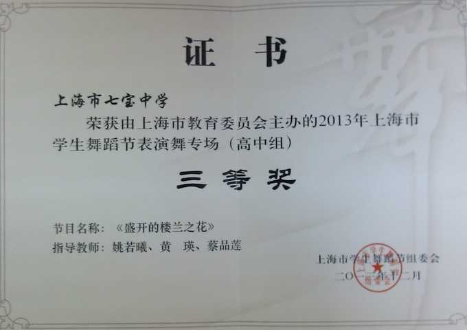 2013.12七宝中学----《盛开的楼兰之花》获上海市教委主办的2013年上海市学生舞蹈表演舞专场(高中组)三等奖(证书).jpg