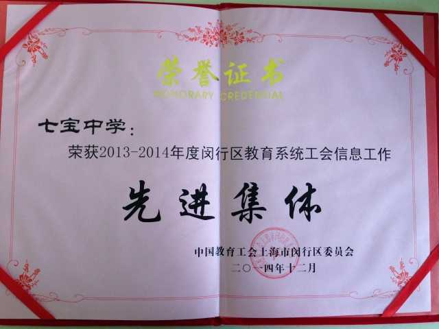 七宝中学----荣获2013-2014年度闵行区教育系统工会信息工作先进集体(证书)