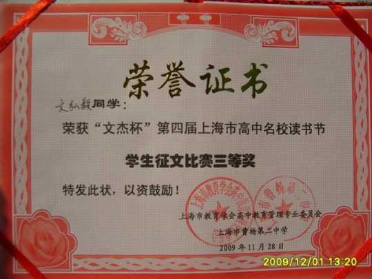 2009.11文弘毅----获文杰杯第四届上海市高中名校读书节学生征文三等奖(证书)
