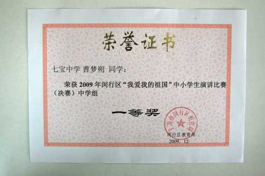 2009.12曹梦朔----获2009闵行区我爱我的祖国中小学生演讲赛(决赛)中学组一等奖(证书)