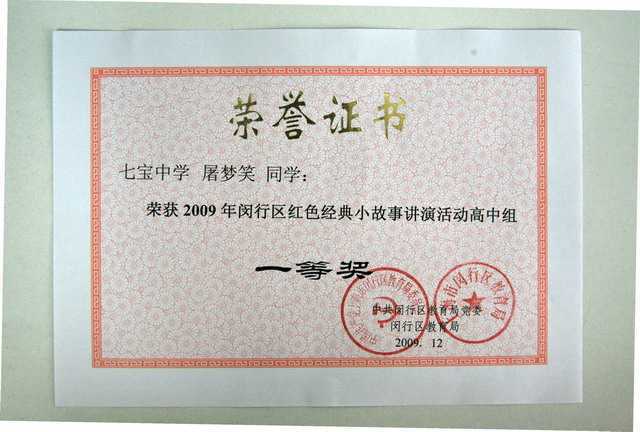 屠梦笑----获2009年闵行区红色经典小故事讲演高中组一等奖(证书)