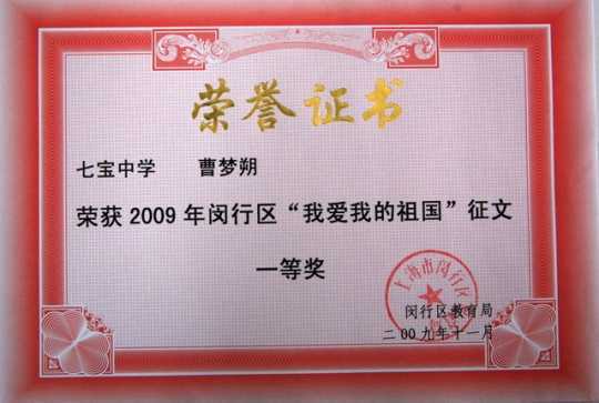 曹梦朔----获2009年闵行区我爱我的祖国征文一等奖(证书)