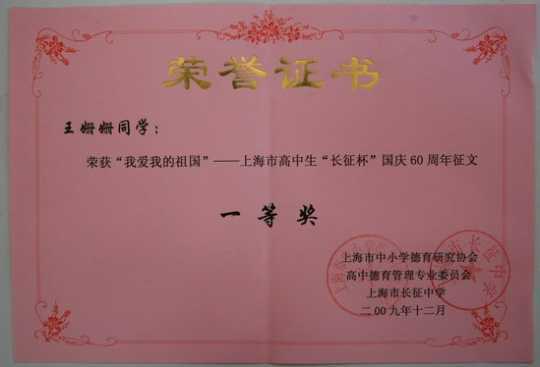 2009.12王姗姗----获我爱我的祖国上海市高中生长征杯国庆60周年征文一等奖(证书)