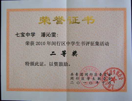 潘沁雯----获2010年闵行区中学生书评征集活动二等奖(证书)
