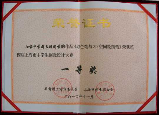 2010.11蒋天玮----作品 取色笔与3D空间绘图笔 荣获第四届上海市中学生创意设计大赛一等奖(证书).jpg