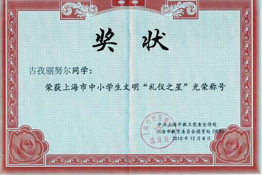 古孜丽努尔·木沙江----获上海市中小学生文明“礼仪之星”光荣称号(奖状)
