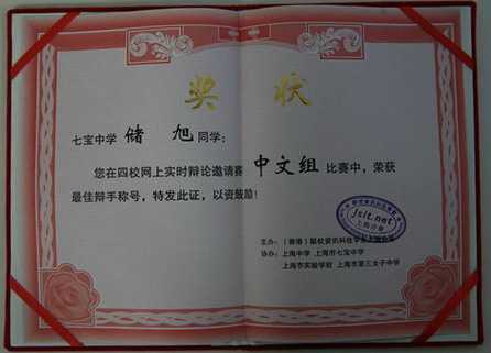 2010.12储旭----获上海四校(上海中学、上海七宝中学、上海市实验学校、上海市第三女子中学)网上实时辩论邀请赛中文组最佳辩手称号(奖状).jpg