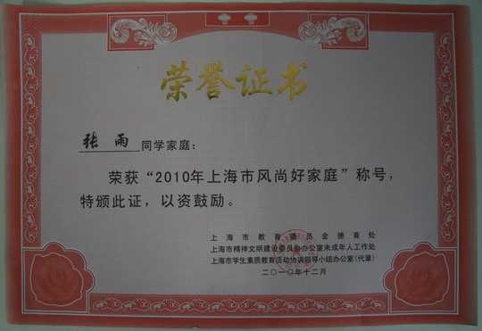 2010.12张雨----获2010年上海市风尚好家庭称号(证书).jpg