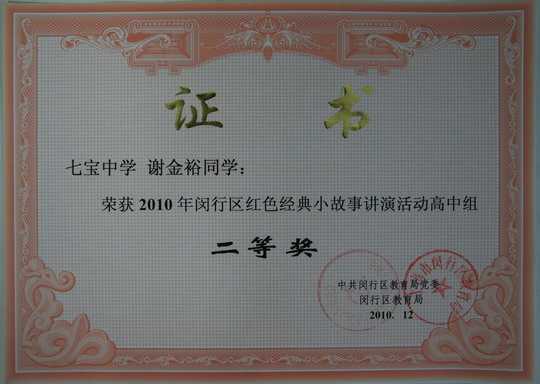 谢金裕----获2010年闵行区红色经典小故事讲演活动高中组二等奖(证书)