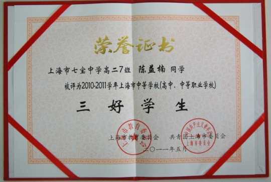 陈益楠----被评为2010-2011学年上海市中等学校(高中.中等职业学校)三好学生(证书)