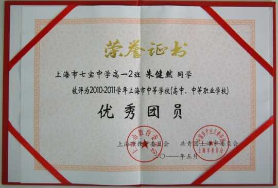 朱健然----被评为2010-2011学年上海市中等学校(高中.中等职业学校)优秀团员(证书)