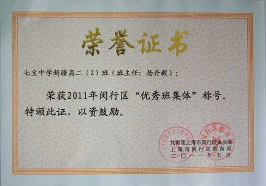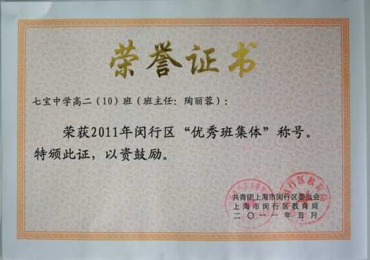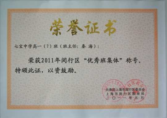 2011.05高一7班(班主任 秦海)----获2011年闵行区优秀班集体称号(证书)2.JPG