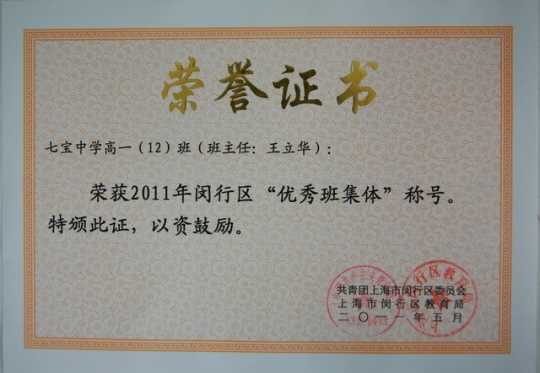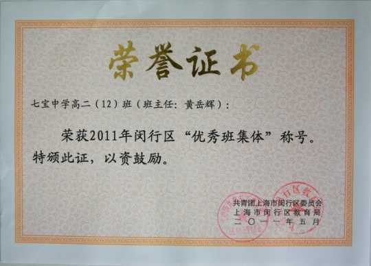 2011.05高二12班(班主任 黄岳辉)----获2011年闵行区优秀班集体称号(证书).jpg
