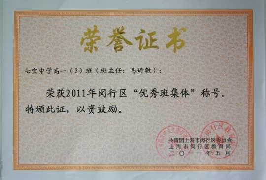 2011.05高一3班(班主任 马琦敏)----获2011年闵行区优秀班集体称号(证书).JPG