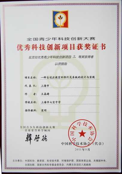 2011.08王晶旖----《一种自适应教室环保灯光系统的设计与实现》获全国青少年科技创新大赛优秀科技创新项目三等奖(指导老师:裴明).jpg