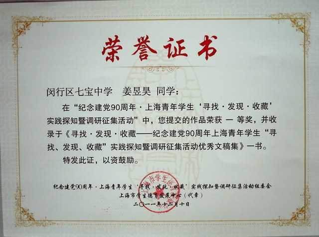 姜昱昊----作品获纪念建党90周年.上海青年学生实践探知暨调研征集活动一等奖(证书)