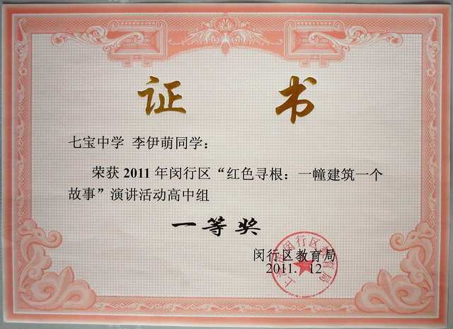 2011.12李伊萌----获2011年闵行区“红色寻根:一幢建筑一个故事”演讲活动高中组一等奖(证书).jpg