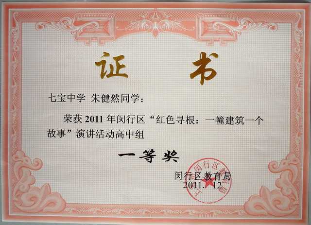 朱健然----获2012年闵行区“红色寻根:一幢建筑一个故事”演讲活动高中组一等奖(证书).