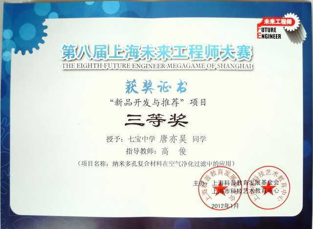 2012.01唐亦昊----项目“纳米多孔复合材料在空气净化过滤中的应用”获第八届上海未来工程师大赛三等奖(证书)(指导老师:高俊).jpg
