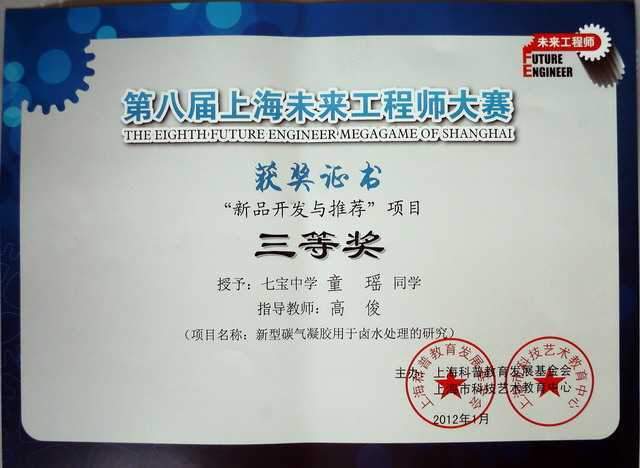2012.01童瑶----项目“新型碳气凝胶用于卤水处理的研究”获第八届上海未来工程师大赛三等奖(证书)(指导老师:高俊).jpg