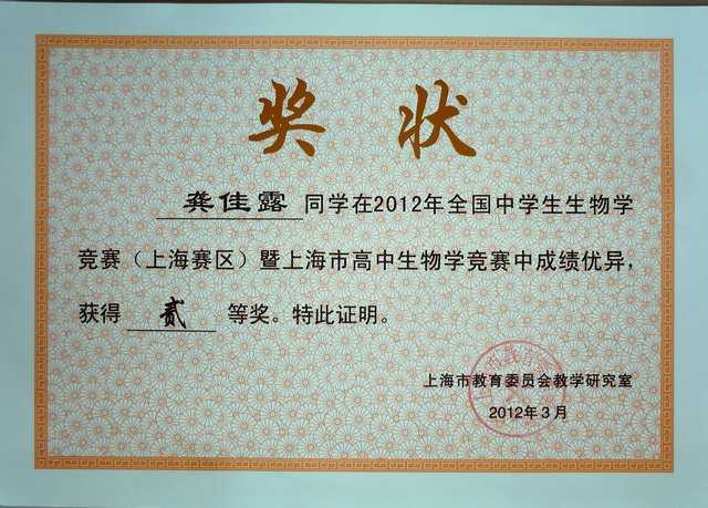 2012.03龚佳露----获2012年全国中学生生物学竞赛(上海赛区)暨上海市高中生物学竞赛二等奖(奖状)