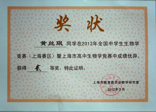 2012.03黄丝珉----获2012年全国中学生生物学竞赛(上海赛区)暨上海市高中生物学竞赛二等奖(奖状)