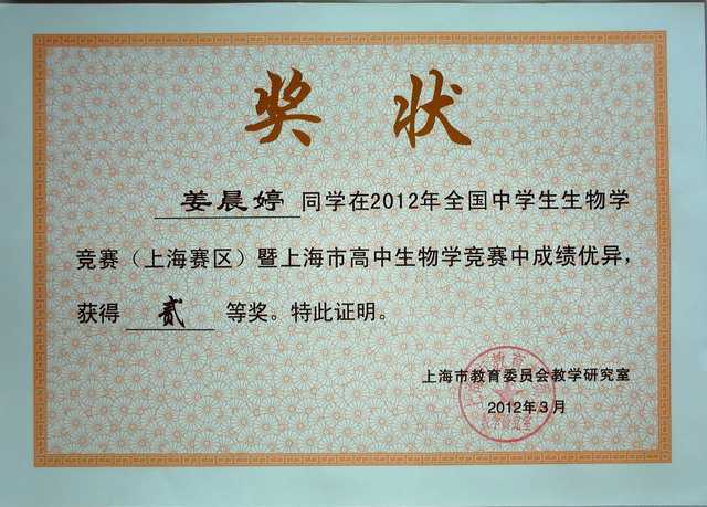 2012.03姜晨婷----获2012年全国中学生生物学竞赛(上海赛区)暨上海市高中生物学竞赛二等奖(奖状)