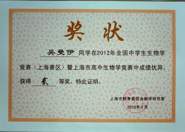 2012.03吴曼伊----获2012年全国中学生生物学竞赛(上海赛区)暨上海市高中生物学竞赛二等奖(奖状)