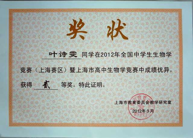 2012.03叶诗雯----获2012年全国中学生生物学竞赛(上海赛区)暨上海市高中生物学竞赛二等奖((奖状)