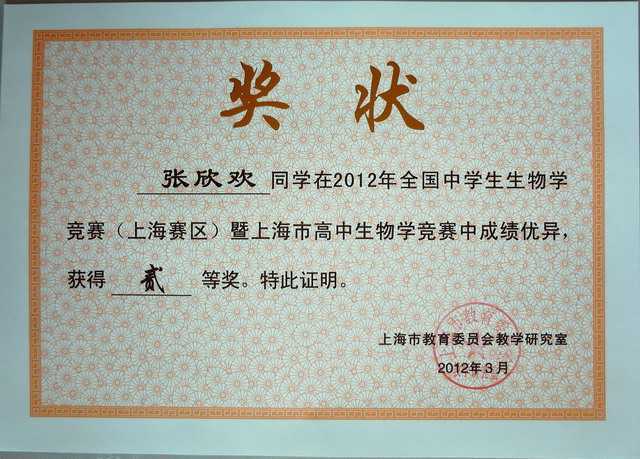 2012.03张欣欢----获2012年全国中学生生物学竞赛(上海赛区)暨上海市高中生物学竞赛二等奖(奖状)