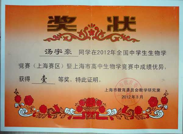 2012.03汤宇豪----获2012年全国中学生生物学竞赛(上海赛区)暨上海市高中生物学竞赛一等奖(奖状).jpg