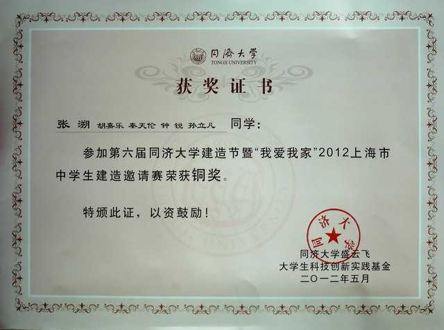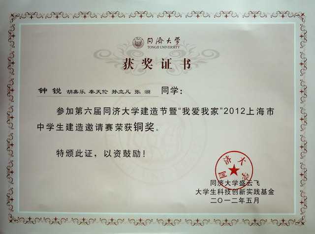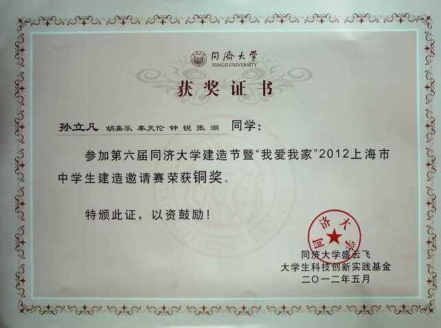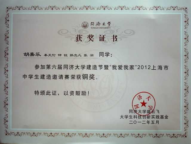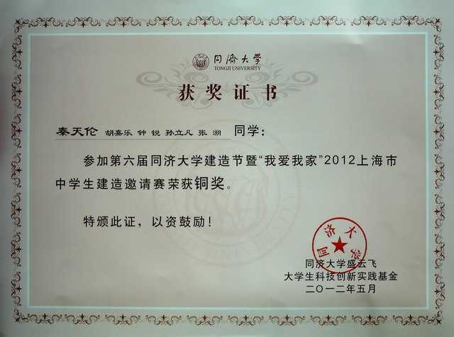 胡嘉乐、秦天伦、钟锐、孙立凡、张溯----获第六届同济大学建造节暨“我爱我家”2012上海市中学生建