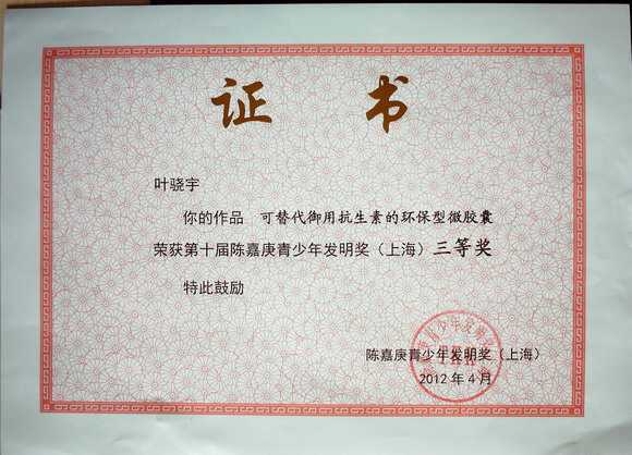 2012.04叶骁宇----作品《可替代御用抗生素的环保型微胶囊》获第10届陈嘉庚青少年发明奖(上海)三等奖(证书).jpg