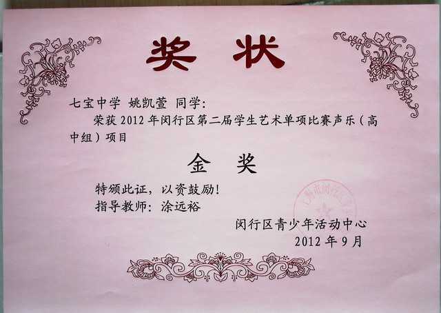 2012.09姚凯萱----获2012年闵行区第二届学生艺术单项比赛声乐(高中组)项目金奖(奖状).jpg