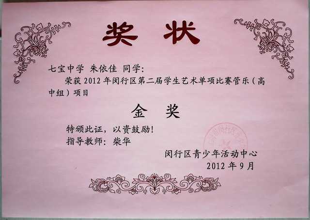 2012.09朱依佳----获2012年闵行区第二届学生艺术单项比赛管乐(高中组)项目金奖(奖状).jpg