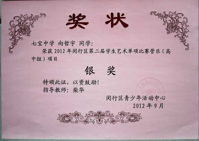 2012.09向哲宇----获2012年闵行区第二届学生艺术单项比赛管乐(高中组)项目银奖(奖状).jpg
