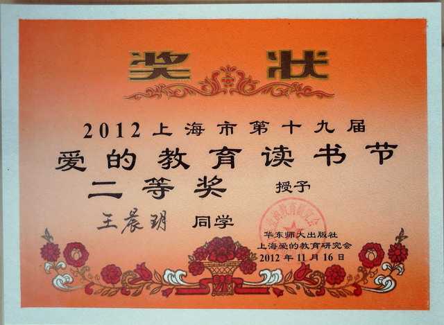 2012.11王晨玥----获2012上海市第19届爱的教育读书节二等奖(奖状).jpg