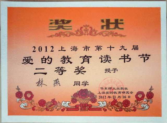2012.11林燕----获2012上海市第19届爱的教育读书节二等奖(奖状).jpg