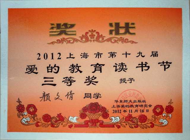 2012.11颜文倩----获2012上海市第19届爱的教育读书节三等奖(奖状).jpg