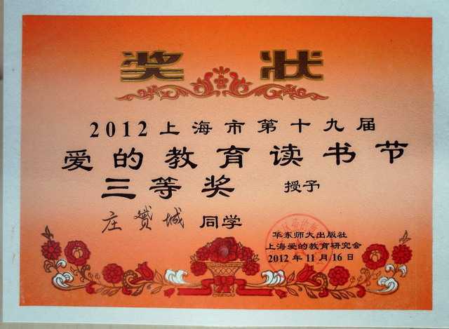 2012.11庄赟城----获2012上海市第19届爱的教育读书节三等奖(奖状).jpg